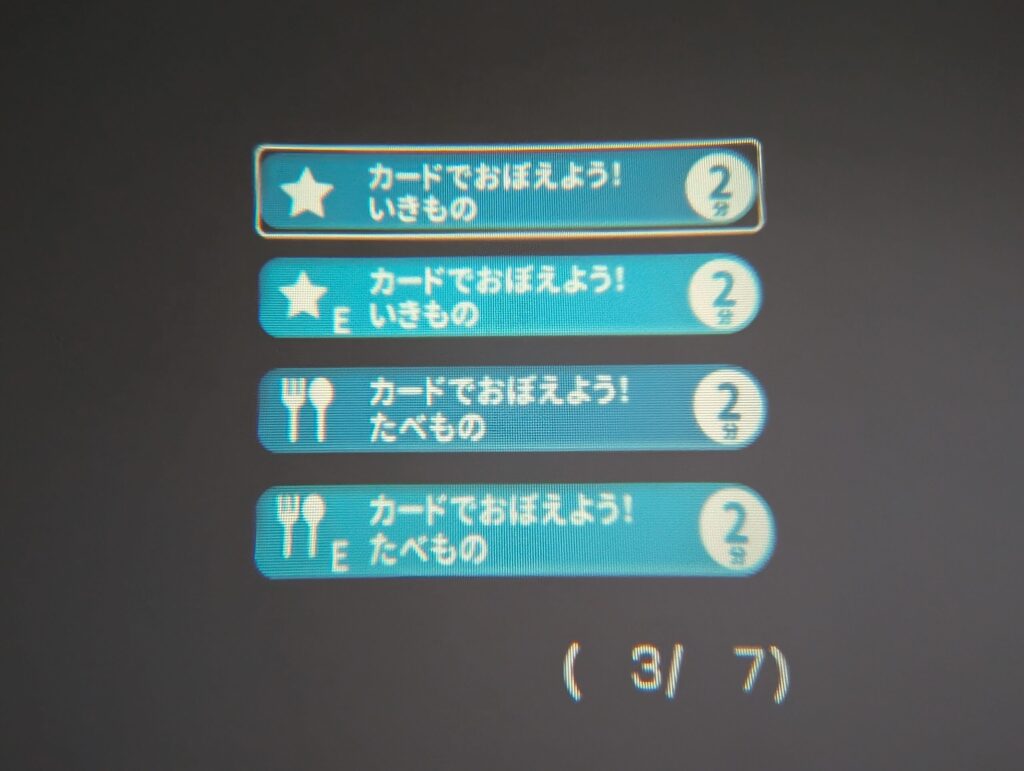 「まなび」のカテゴリーの中にあるカードでおぼえよう!シリーズで、出てくるカードを復唱するうちに、いきものや食べ物の語彙が増えてきました。